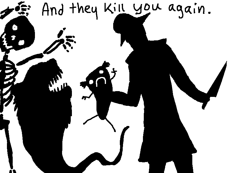 The dead bodies, skeletons, blood are brilliant. The black and white panel "All of these things want to kill you" with all the glistening teeth is some of your best artwork yet. :D